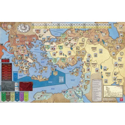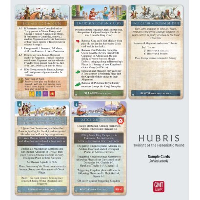 Hubris – Twilight of the Hellenistic World is played in five-year turns. Every turn sees the introduction of new leaders and events, feeding a single deck of events governing the occurrence of recurrent or one-off events, game administration mechanisms, and kingdom activation opportunities and sequence.